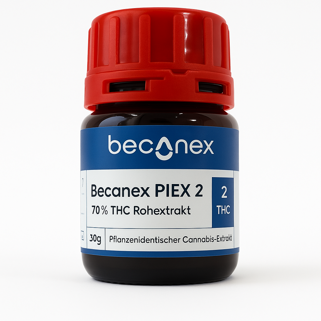 Becanex PIEX 2 | 70 % Rohextrakt ist ein hochwertiger, pflanzenidentischer Cannabisextrakt, der das natürliche Terpenprofil der ursprünglichen Cannabisblüte in konzentrierter Form widerspiegelt. Der Fokus liegt dabei auf der Erhaltung der therapeutisch relevanten Inhaltsstoffe, insbesondere der Terpene, die maßgeblich zur pharmakologischen Wirkung beitragen. Der Extrakt enthält einen Gesamt-THC-Gehalt von 70 % und einen Terpengehalt von etwa 3,5 %, was ihn zu einem der aromatisch und medizinisch ausgewogensten Rohextrakte am Markt macht.